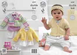 King Cole Pattern 4197 Cherish & Cherished DK Cardigans & Headband Easy 4 Row Lace Pattern 41-66cm, 16-26in.?? 0-7 years Round Neck Cardigan:? 2 balls for sizes: 16-18, 18-20 & 20 – 22, 3 balls for sizes 22-24 & 24 – 26 in V Neck Long Sleeved Cardigan:? 2 balls for sizes: 16-18, 18-20 & 20 – 22, 3 balls for sizes 22-24 & 24 – 26 in V Neck Short Sleeved Cardigan:? 1 balls for sizes: 16-18 & 18-20, 2 balls for size:? 20 – 22, 22-24 & 24 – 26 in Headband:? 1 ball King Cole Cherish DK & Cherished DK 100gm, also suitable for other King Cole DK yarns, amounts may vary. Shades 1415 Gold, 1599 Rhubarb & 1420 Lemon shown on pattern.